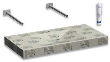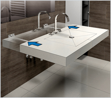 The LAVADO-FLOAT models are panels made of hard foam support material, which can be individually tiled. Two stainless steel brackets ensure stable suspension. The washstands can be shortened at the sides, which enables them to be adapted to smaller bathrooms. The construction of a row of washstands is also possible by means of arranging and gluing together several washstands.