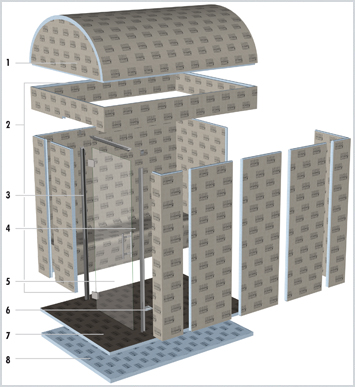 A MODUL steam room is a square or rectangular cabin of hard foam support material of between 1500 x 1500 and 3000 x 3000 mm and is made up of the following components: